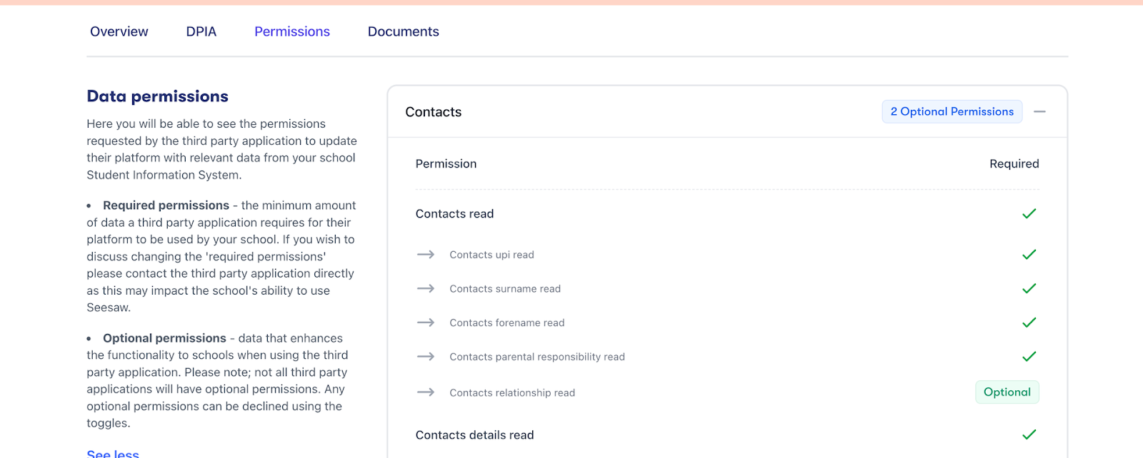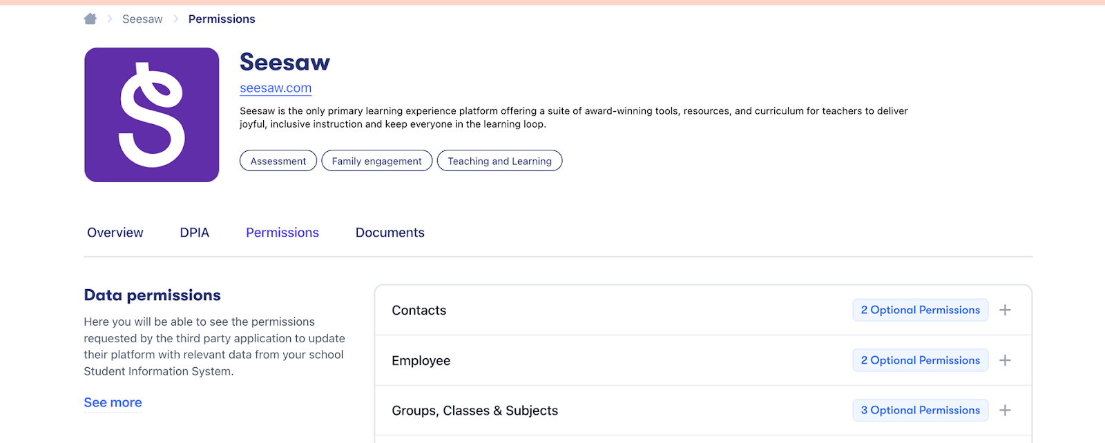 When making purchasing decisions for an application, you’ll want to check that it adheres to your school's data sharing policy. To allow you to assess an application’s data requirements quickly and efficiently, we have made the permissions they require visible in the application directory, even before you connect with the application.