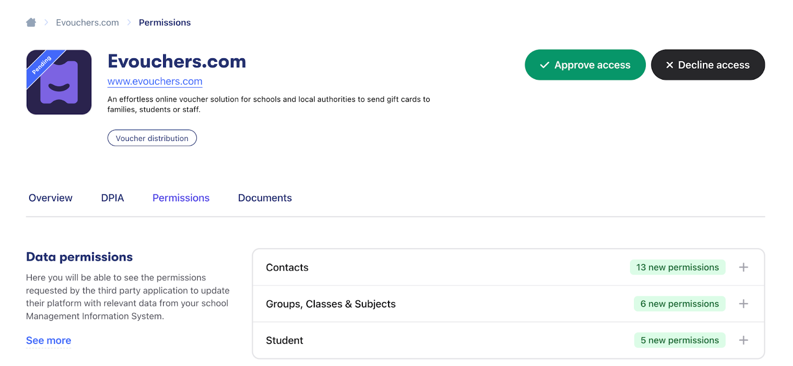 New applications need to request access to relevant data from your schools Management Information System (MIS) to enable you to enjoy the features and benefits of their product. Through your Wonde School Portal, you will be able to view each request and approve, decline, or revoke them. Your school will always have full visibility and control over the data you share.