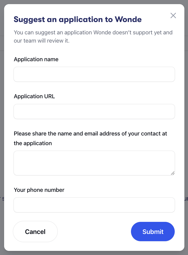 To suggest the application to Wonde, select the Suggest application button. You will see the form below appear. Please complete the form, populating the application name, URL and your phone number, and we will review it.